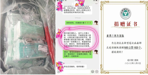 09届电子商务专业徐培军校友、03届英语专业应华亮校友,85届日语专业赵为校友在自己经营的企业职工防护物品十分紧缺的情况下,他们还是通过多种渠道购买了口罩等防护物品,并在第一时间寄到了学校。08届英语专业朱新海校友虽然身在国外,但仍想方设法购置了一些口罩寄到学校。此外,06届英语专业褚颖校友将5000只自己企业生产的医用口罩捐赠给了母校,20届酒店管理专业,目前尚在实习阶段的卢波同学也向学校捐赠了口罩,19届工商管理专业蔡梦晨、物流专业曹泳莲和张惠正等校友在泰国攻读硕士,她们从网上了解到国内疫情后,从泰国购买了一些口罩和护目镜,并委托在同一所学校攻读博士的我校国际商学院邹兵老师带回国内,捐赠给母校。03届英语专业曾险校友身在新西兰,一直十分关注国内疫情,疫情发生后,他从新西兰寄回N95口罩和医用外科口罩至绍兴第二医院,在用自己的实际行动支援祖国抗疫工作的同时,也向母校捐赠了一部分口罩。03届英语专业洪克飞和04届英语专业魏达等校友千方百计地利用自己的国外资源为母校购置口罩。另外,在这一阶段还不断有校友来咨询相关信息,等等。