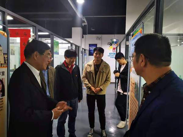 来到学生创业工作室“绍兴樾拓文化发展有限公司”,徐校长亲切的询问创业团队负责人(西班牙语大四学生叶鹏辉)创业情况及目前遇到困难,“我们目前已注册公司两家,其中一家在社会运营,一家在学校创业园和创业街运营,毕业后,打算和创业团队把公司做的更好……”。徐校长一边肯定,一边勉励,希望他们努力创业,向优秀企业和企业家学习,在实践中成长,同时兼顾好学业,做到创业、学业双丰收。了解到叶鹏辉同学还是退役复学学生,更鼓励其争做退役复学的先进典型。
