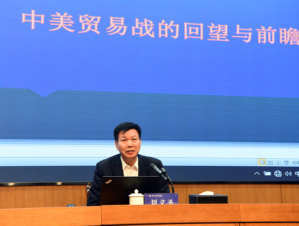 活动最后,刘义圣教授以《中美贸易战的回望与前瞻》为主题,为学校40周年校庆系列学术活动作了首场报告。他从美国发起贸易战的原因讲起,以幽默易懂的语言,将其中利弊娓娓道来,他指出,不管局势如何变化,我们都应不忘初心,牢记使命!