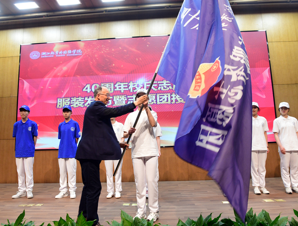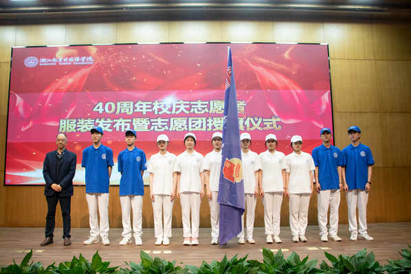 随后,40周年校庆志愿者服装正式亮相活动现场。志愿者服装共有白色和越秀蓝两种颜色,衣服胸前印有校徽,袖口上印有40周年校庆纪念徽标,展示了越秀学子青春洋溢、活泼向上的精神风貌。