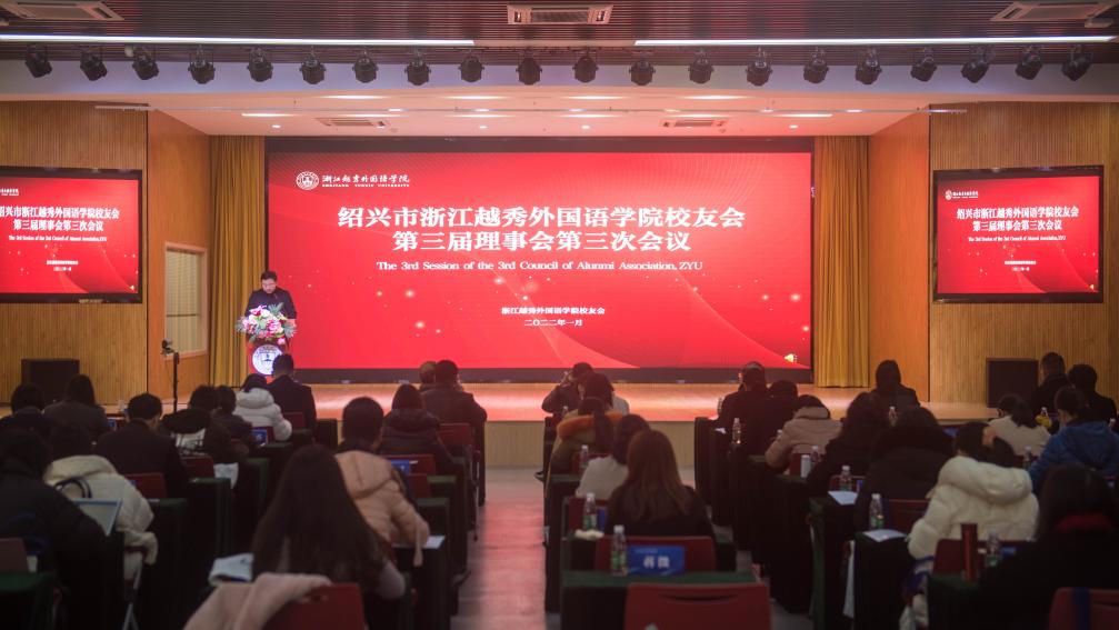 2022年1月2日上午,浙江越秀外国语学院校友会第三届理事会第三次会议在镜湖校区越秀厅举行。学校校长徐真华、费君清教授、校友总会会长徐左平、党委副书记、校友总会副会长施文妹、财务总监,校友总会常务理事高琴波、校长助理、校友办公室主任王建忠老师,以及校友会校友理事和校友工作老师近百人参加会议。受疫情影响,本次会议采用线上线下同步进行,20余名校友理事在线上通过“钉钉”会议APP,同步参加了本次会议。会议由学校党委副书记、纪委书记、校友总会秘书长高志栋主持。