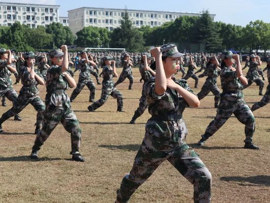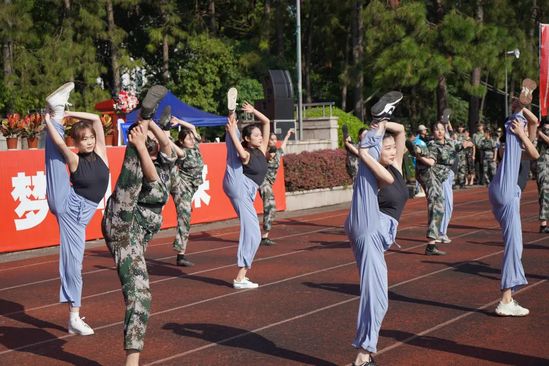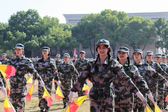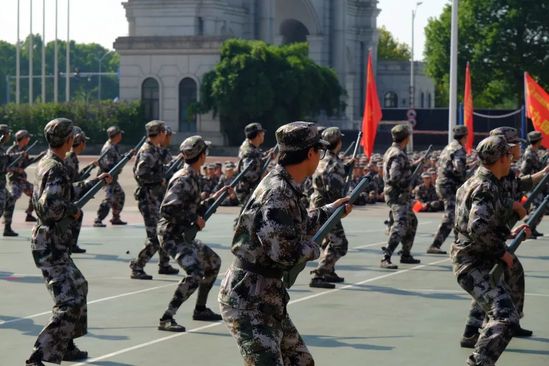 在慷慨激昂的音乐中,女子方阵队带来了匕首操表演,她们的动作行云流水,尽显飒爽。男子刺杀操表演身姿矫健,尽聚青年军魂,彰显青年英姿。在气魄雄宏的呐喊声中,汇报表演走向高潮。旗语方阵手举彩旗,步伐轻快,在秋日的阳光下格外耀眼夺目。