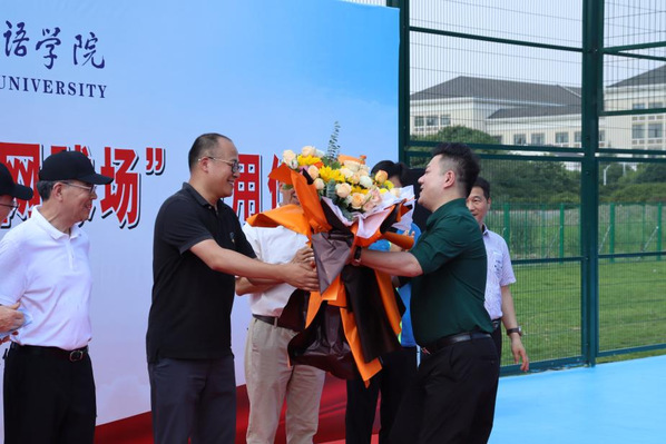 费君清在致辞中,代表学校对朱重阳校友捐资助力母校的建设发展表示衷心的感谢。他表示,网球场的设计新颖、风格别致、功能齐全,相信网球场在未来的校园文化生活中将起到重要作用。他对今后网球场的使用和管理提出以下三点要求:一是要做好场地的管理及维护,保持场地整洁;二是要提高场地的使用率;三是要积极开展网球交流、竞赛等活动,营造浓郁的校园文化氛围。
