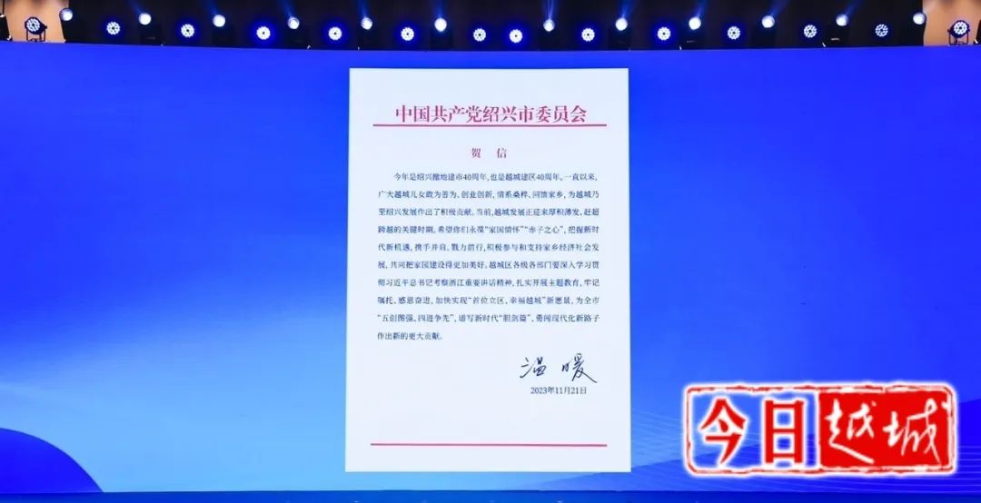 温暖在贺信中指出,今年是绍兴撤地建市40周年,也是越城建区40周年。当前,越城发展正迎来厚积薄发、赶超跨越的关键时期,希望大家永葆“家国情怀”“赤子之心”,把握新时代新机遇,携手并肩、勠力前行,积极参与和支持家乡经济社会发展,共同把家园建设得更加美好。越城区各级各部门要深入学习贯彻习近平总书记考察浙江重要讲话精神,扎实开展主题教育,牢记嘱托、感恩奋进,加快实现“首位立区、幸福越城”新愿景,为全市“五创图强、四进争先”,谱写新时代“胆剑篇”、勇闯现代化新路子作出新的更大贡献。