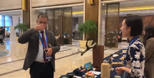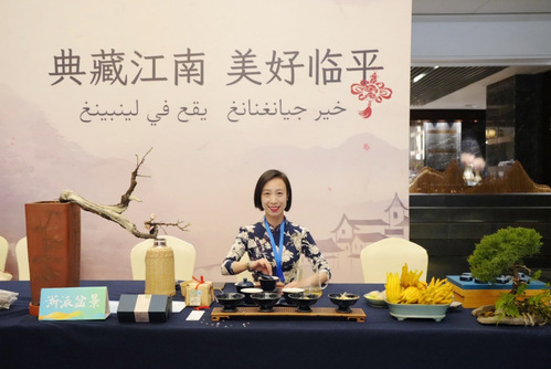 我校校友王斌作为非物质文化遗产代表性传承人,在现场向外国友人推荐浙派盆景与三清茶,向外国友人传扬中华文化。