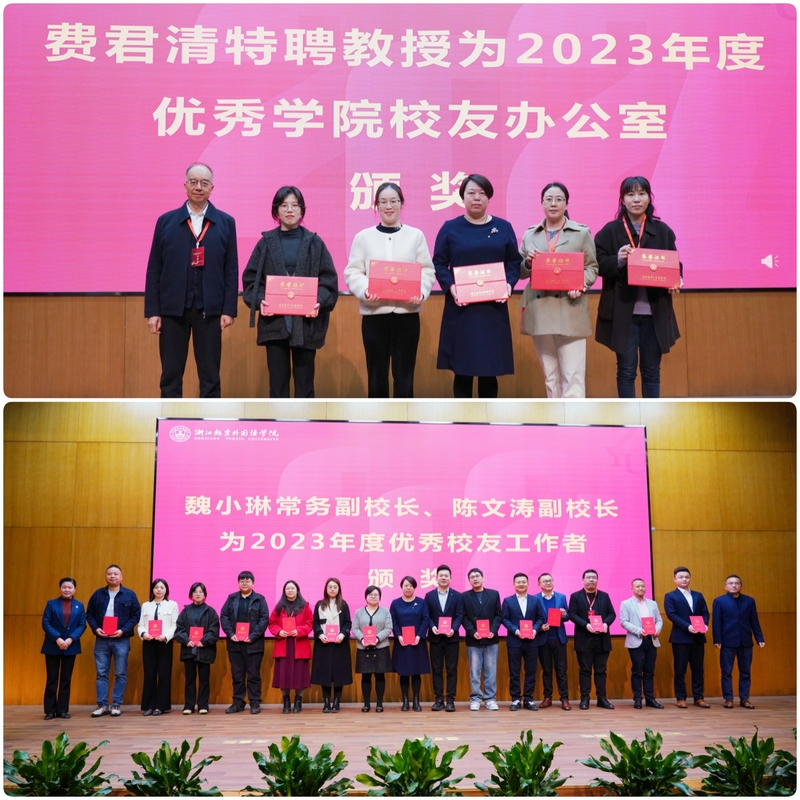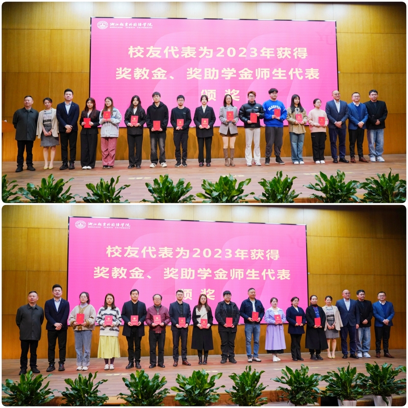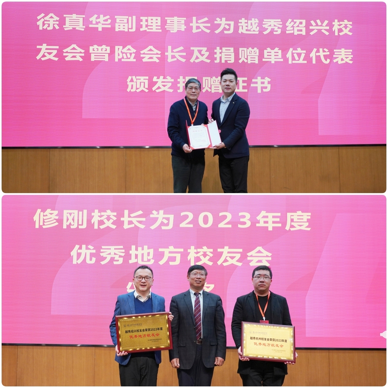 会上,徐真华副理事长为捐赠校友代表新西兰利杰国际集团董事长曾险和两家企业代表颁发捐赠证书,感谢他们对学校事业的鼎力支持。修刚校长、费君清特聘教授、魏小琳常务副校长、陈文涛副校长分别为优秀地方校友会、优秀学院校友办公室和学校优秀校友工作者颁发了荣誉证书,以表彰他们在校友会工作中的突出贡献。此外,校友代表章小军、曾险、应华亮、冯迪洋、朱重阳、江建琴为学校2023年获得奖教金、奖助学金的师生代表颁奖,激励广大师生接续奋进,为学校高质量发展贡献智慧和力量。