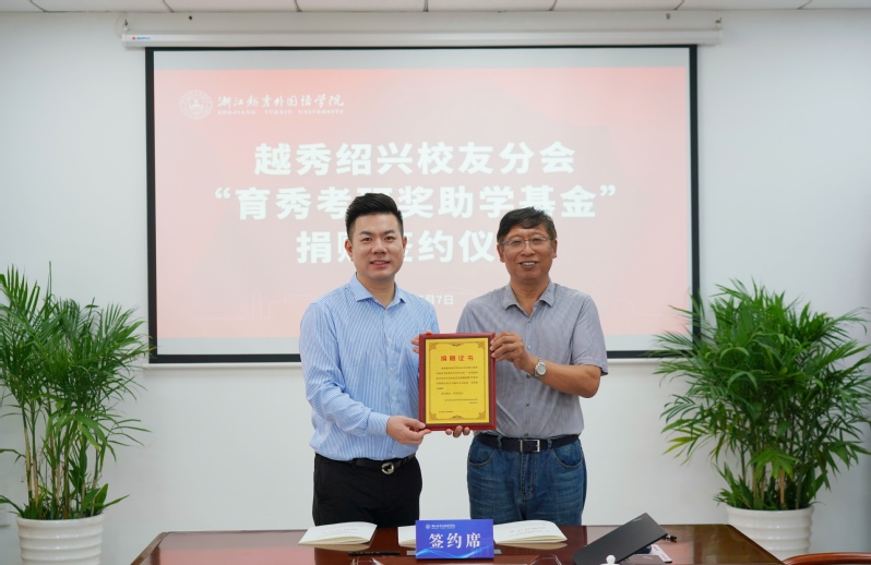 5月7日上午,一场特殊意义的捐赠仪式在浙江越秀外国语学院镜湖校区举行。此次捐赠由2003届英语专业毕业生、新西兰利杰国际集团董事长、学校校友总会副会长、越秀绍兴校友分会会长曾险发起,浙江越秀外国语学院绍兴校友分会出资人民币100万元,在母校专项设立了“育秀考研奖助学基金”,旨在支持学校的人才培养工作,主要用于在五年内资助约200名品学兼优的家庭经济困难学生考研深造。