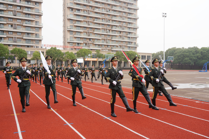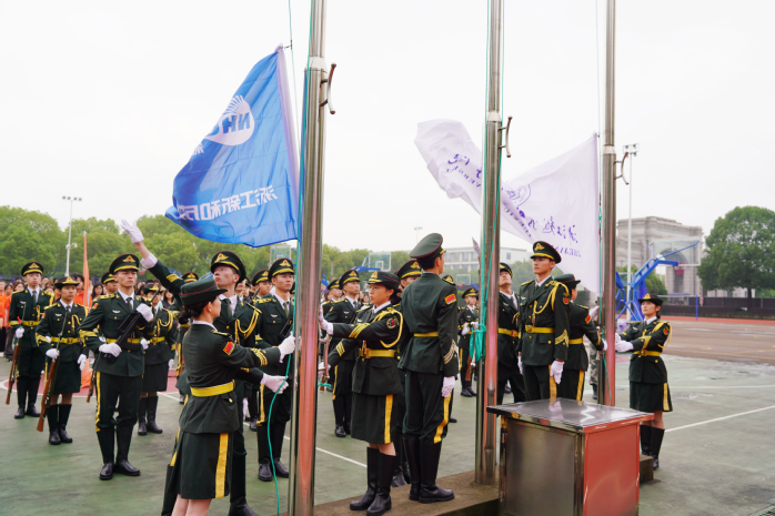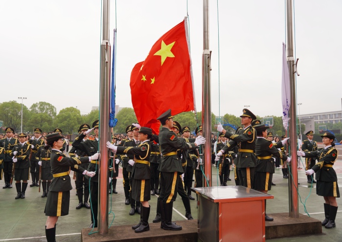 大学生教官队国旗仪仗队员迈着铿锵有力的步伐走向升旗台,伴随着雄壮的国歌声,鲜艳的五星红旗冉冉升起。随后,学校校旗也徐徐升起,与国旗共同飘扬在校园上空。全体师生肃立,目光凝视,心潮澎湃,深情表达对祖国的热爱和对母校生日的祝福。