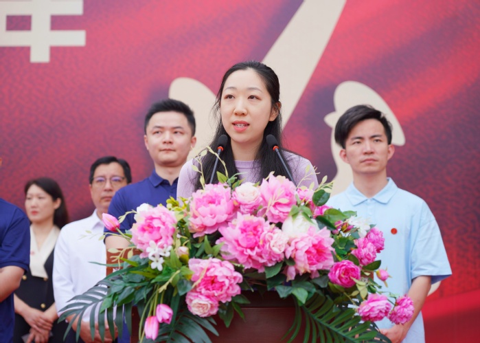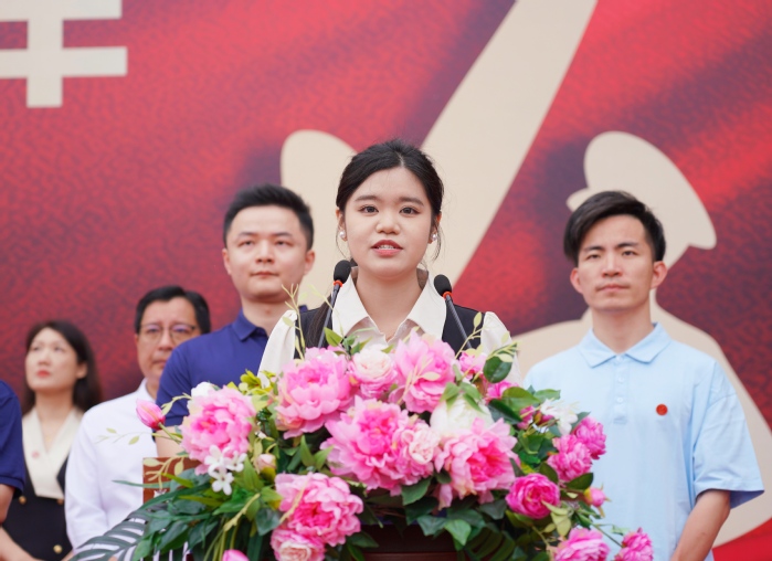 中国语言文化学院周怡博士作为教师代表发言,分享了自己作为青年教师在越秀的成长经历。她表示,参加校庆日升旗活动,感受着四十三载春秋的厚重与积淀,满怀激动与自豪。在“以学生为中心”的育人理念下,全体越秀教师潜心育人,不仅传授知识,更传递着梦想与力量。站在新的历史起点上,全体师生对越秀的未来充满了期待,“越秀之舟,扬帆远航;梦想之路,永不止步”,愿大家一起携手共进,共创越秀更加辉煌的明天。