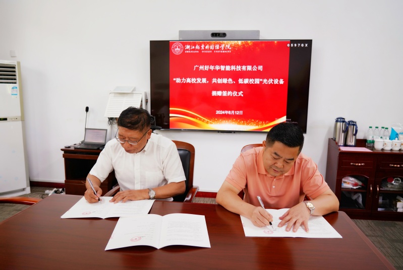 6月12日下午,浙江越秀外国语学院与广州好年华智能科技有限公司光伏设备捐赠签约仪式在稽山校区举行。此次活动由学校校友总会、教育发展基金会、后勤保障处共同主办,旨在推动学校绿色发展,构建低碳校园。