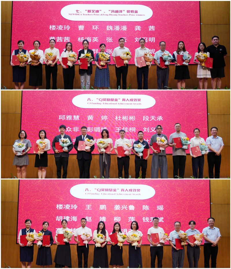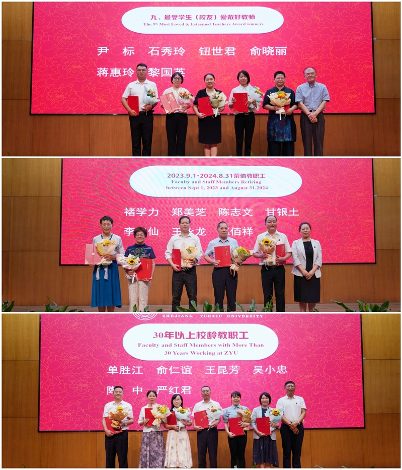 随后进行的退休教师荣休仪式、30年以上校龄教职工表彰仪式上,校领导向教职工颁发证书并送上鲜花,衷心感谢他们为越秀建设发展辛勤耕耘、无私奉献。
