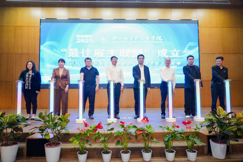 活动现场,氛围热烈。学校领导、“最佳雇主联盟”代表及行业导师代表共8人一同上台,共同启动立柱,宣告浙江越秀外国语学院“最佳雇主联盟”正式成立和“Young帆启航”就业创业训练项目开启崭新篇章。