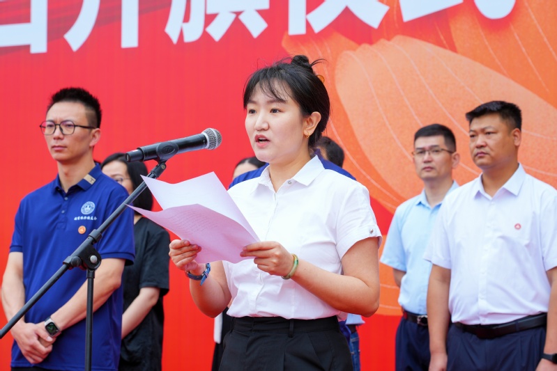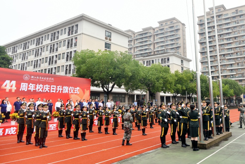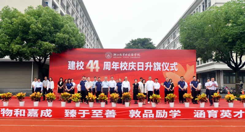 6月12日,浙江越秀外国语学院举行校庆日升旗仪式,庆祝学校44周年华诞。学校特聘教授费君清、副校长葛金玲、党委副书记兼纪委书记高志栋、校长助理朱新福、校友总会会长徐左平,校友代表曾险、陆方明、应华亮、吴丽云、吴君、孙剑、徐诗琪、唐哲源、黄经纬,学校机关部处和二级学院负责人,师生代表等参加活动。高志栋主持升旗仪式。