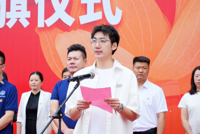 网络传播学院数字媒体艺术2202班杨德星同学作为学生代表发言。他回顾了大学生活中从志愿服务,到学科竞赛,再到团学工作的历练挑战,感谢学校提供了广阔的平台。他坚信,无论未来走向何方,都不会忘记,自己是越秀人,是越秀精神的传承者。